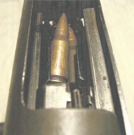 The device enabled me to replicate the stoppage which was caused by the front of the top cartridge in the magazine being turned in when the feed horn of the bolt passed over the cartridge’s rim during the rearward movement of the bolt. This round did not jump out, but remained in the position shown (photo 2).
