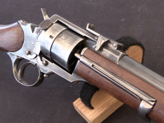 Designed by A. Noël in 1865 and manufactured by Gouery, Canat et Cie in Paris, this is a .28 caliber, 10-shot turret revolver. It has a folding double-action trigger, and is actually a remarkably svelte […]