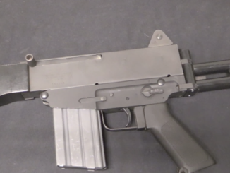 The uppers were made in three barrel lengths, and I have here an example of a first generation full-length rifle and a second generation SBR with a 6.25″ barrel and a GSL Technology suppressor nested inside the handguard.
