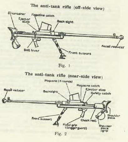 The Boys AT Rifle was put into production in England in 1937, and was effective against light tanks at that time. It was a fairly orthodox bolt action design, using a 5-round magazine and a .55 caliber (14mm) projectile at 2640fps. Initial doctrine had the Boys considered effective to 500 yard, but this dropped as the war progressed, and even with improves projectiles (tungsten core) effective range dropped to 300 yards, with 100 being recommended. While tanks because too heavily armored to be much threatened by the Boys, it continued to be useful against gun emplacements and light armored vehicles such as halftracks and scout cars.