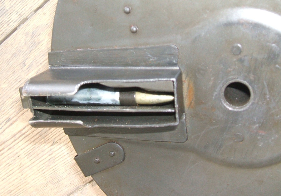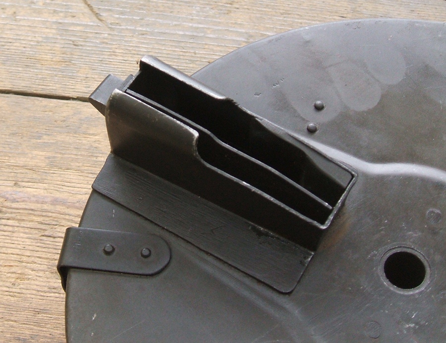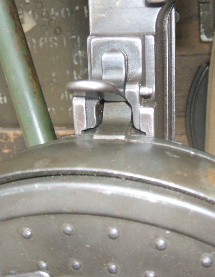 You might be wondering how you are supposed to use the sights with that drum in place – well, you don’t. The drums were intended for antiaircraft use, and thus the guns using them would have taller AA spider sights installed. Some were also uned on armored vehicles, but this was more of an afterthought and not the original intent. The drum requires an additional mounting bracket to hold the front end in place, while the rear of the drum has a set of feed lips like a regular box magazine and snaps into the magazine catch. As you can see below, the drum adapter does not preclude the use of standard box magazines.