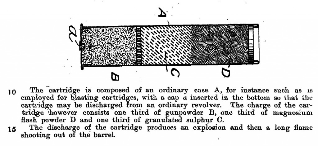 You may have heard of the Velo-Dog revolvers in tiny calibers meant to ward off dogs chasing bicycles, and this was meant to address the same problem. The mixture Behr was patenting? Equal parts gunpowder, magnesium powder, and granulated sulpher. Yep, it’s basically a 19th century pepper spray flash-bang…or Dragon’s Breath ammo for a revolver: