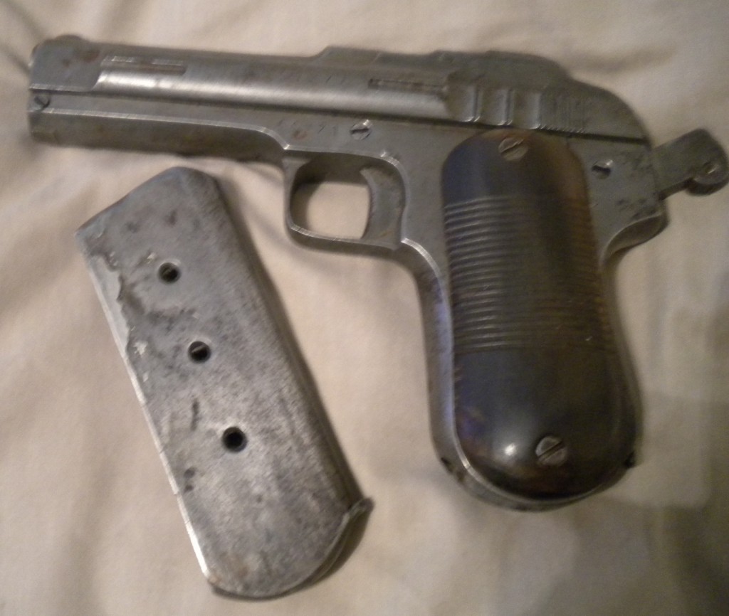 Well, I got an email from reader Tim looking for information about a weird pistol. That he had gotten at a yard sale. For $40. That rotten SOB. 🙂