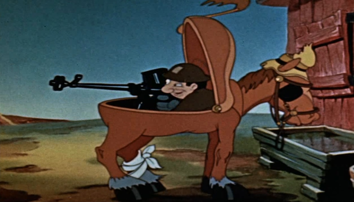 Produced in 1942 for the Canadian military, it is a training film on the operation and maintenance of the Boys anti-tank rifle. The Disney contribution is in animated x-ray views of the various parts of the gun, and about 3 minutes of introduction featuring a section of Nazi tanks (the lead one driven by none other than Adolf Hitler) being surprised and driven back by a bunch of plucky doughboys hiding Boys AT rifles in bushes, outhouses, and horses.