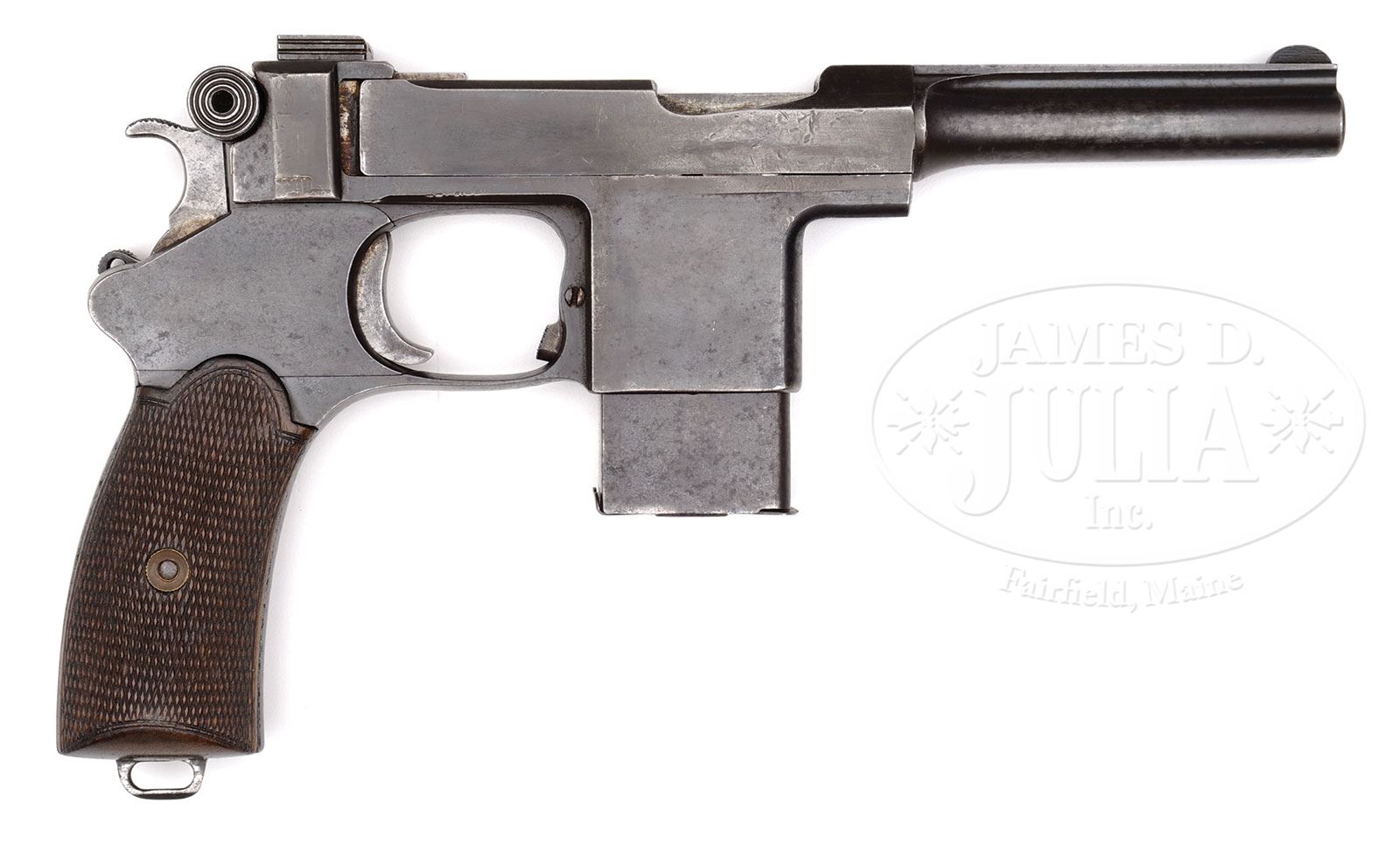 Presumably Bergmann spent the years between 1905 and 1908 looking for a new subcontractor to manufacture his pistols – someone with adequate firearms experience. By 1908 he had found such a firm – the longtime armsmaker: Societe Anonyme Anciens Establissments Pieper located in Herstal Belgium. AEP was willing to finish making the pistols for the Spanish order, and was also granted a license to manufacture and market the 1903 pistol commercially. They did this under the trade name “Bayard” – which is why these later Bergmanns are often called Bergmann-Bayard pistols. These Belgian-made examples have serial numbers starting at 1000.