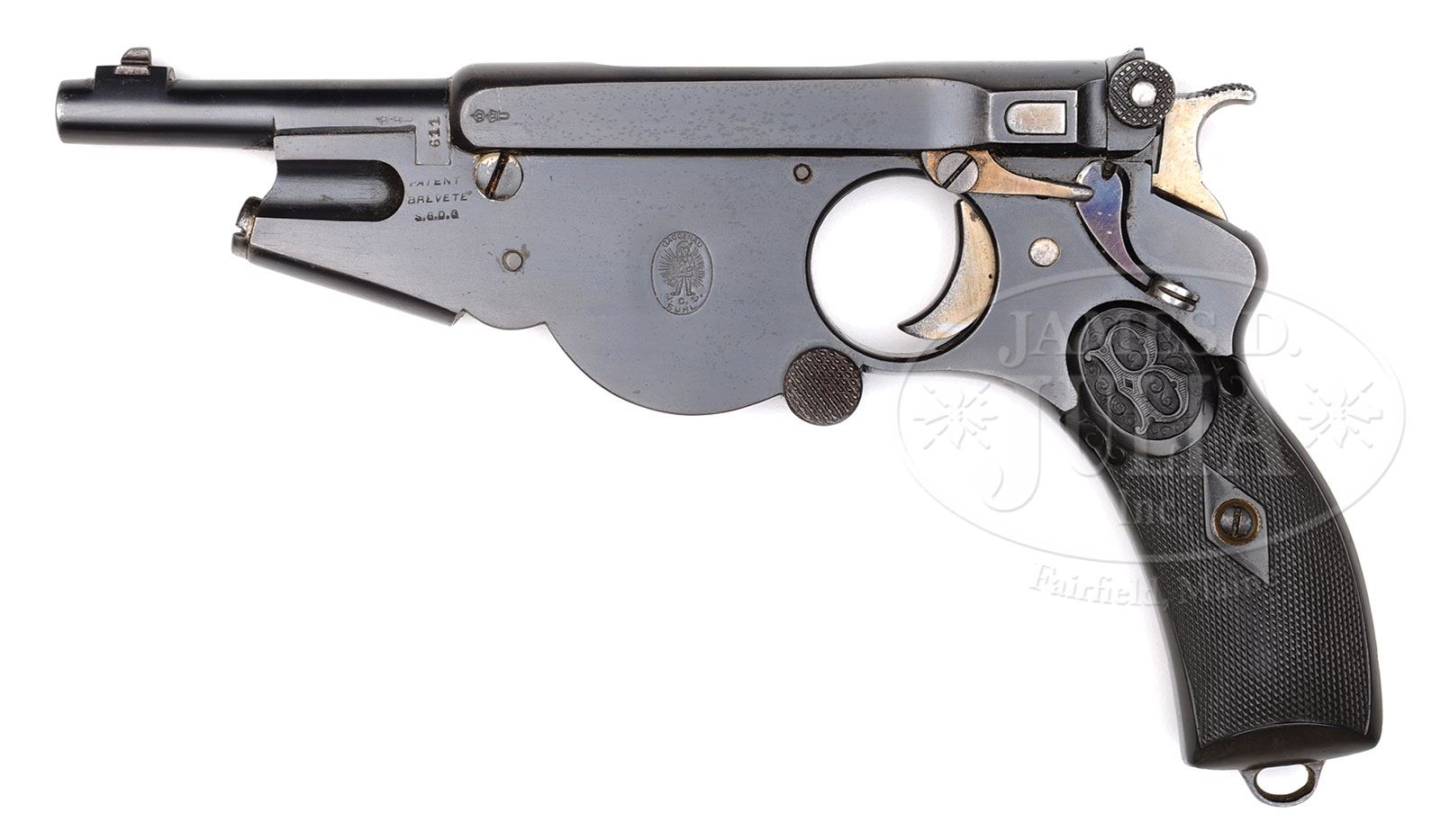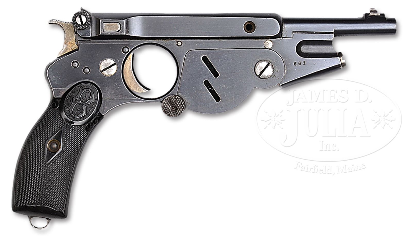 Ejection on the No.2 was vertical, out the top of the action. Unlike the larger versions of the 1896 design, the No.2 did not have a protective cover over the ejection port – probably because the pistol was too small for this to be conveniently made without being too flimsy. One other feature unique to the No. 2 was the option of a folding trigger. This was not an uncommon design element in period revolvers intended for pocket carry, but it was unique in selfloaders.