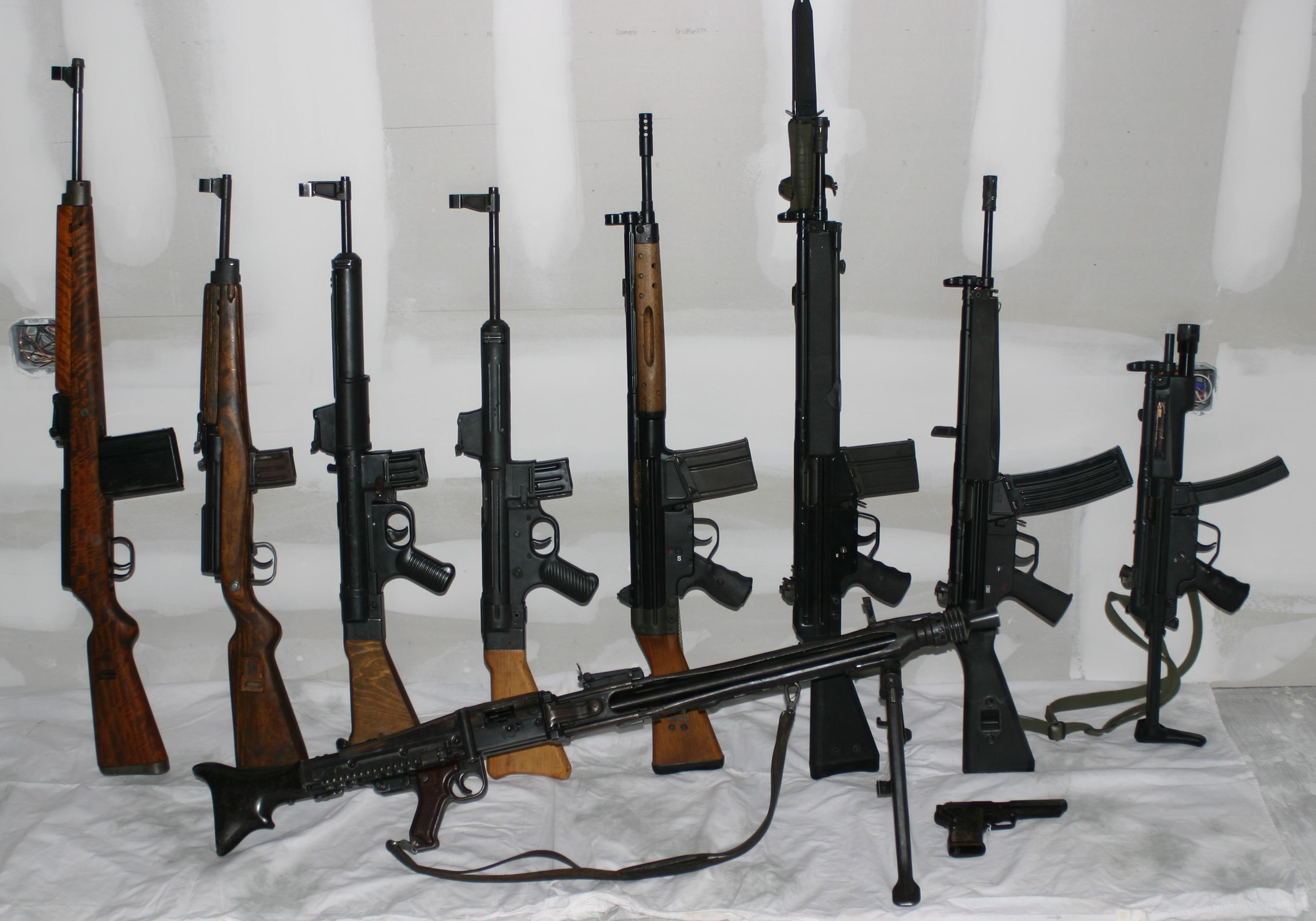 Yep, if guessed roller locking, you are correct. The machine gun at the bottom is of course an MG42, the first successful roller locked firearm. The rifles are in chronological order, from left to right: