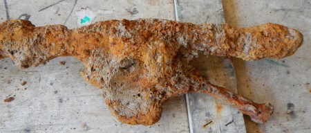 In all seriousness though, what would you do to this to make it into a museum piece? Try and remove some of the corrosion to better represent the true shape, or just treat it with some sort of preservative (polymer resin to penetrate and seal maybe?) and leave as-is? I cannot imagine that there is a lot of un-oxidized metal left, so complete removal of the corrosion would probably not leave you with much, but at the same time it is not immediately recognizable in its current shape.