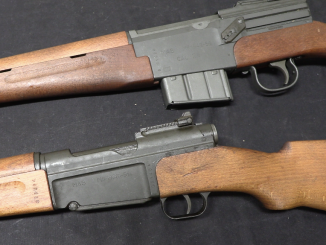 I have to say though, watching Ian M’Collum shoot this thing that the three shots are delivered very quickly indeed, and that the movement of the weapon appears minimal… On the other hand, I note that his trigger finger is basically configured like mine is when I fire a double-action revolver, not a rifle! Bullpups do have problematic triggers, and so certainly Ian M’Collum has ample experience with his own self-loading-only FAMAS and knows how to work the trigger. I do think those of us shaped by the U.S. “gravel belly” target shooting vs. actual combat shooting would be concerned about the trigger, however…