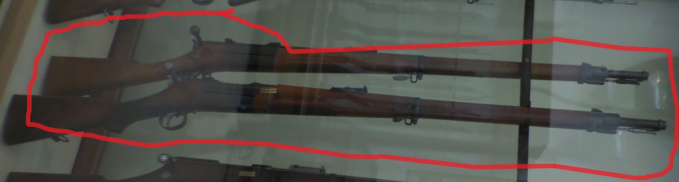 Secondly, we got an email from David, who is trying to identify a couple rifles. They are on display at the Belgian Army museum in Brussels, but unlabeled, and apparently the museum staff on hand weren’t sure what they were. I can’t identify them either, but I figure someone reading this probably can. Any ideas? They’re in a rack with a bunch of old Mannlicher straight-pull rifles, but those may or may not be related to these two.