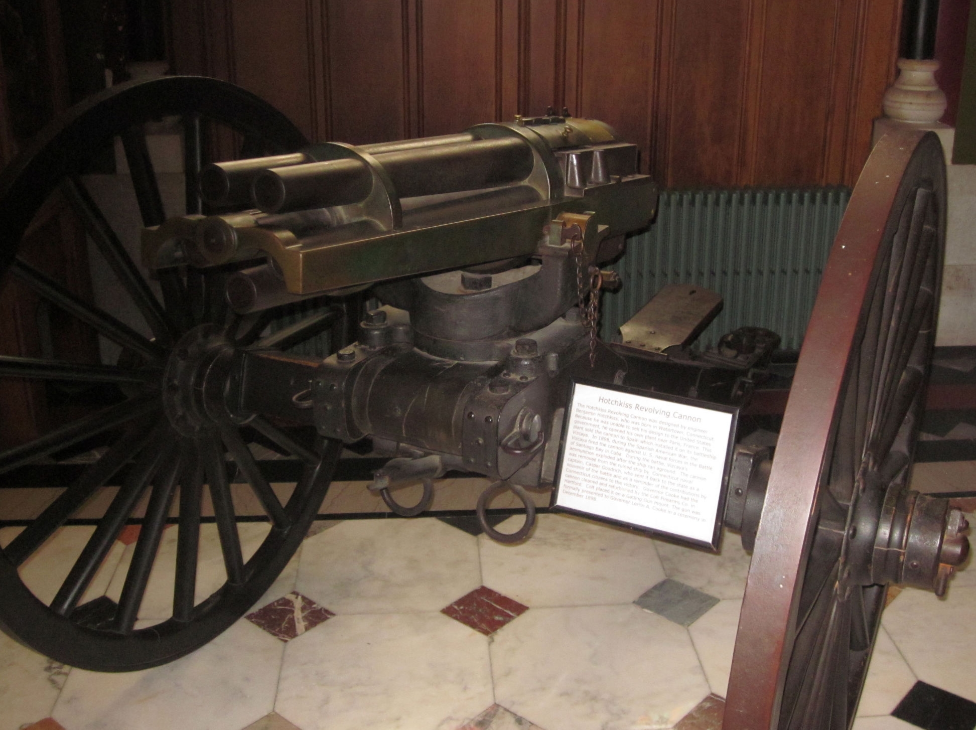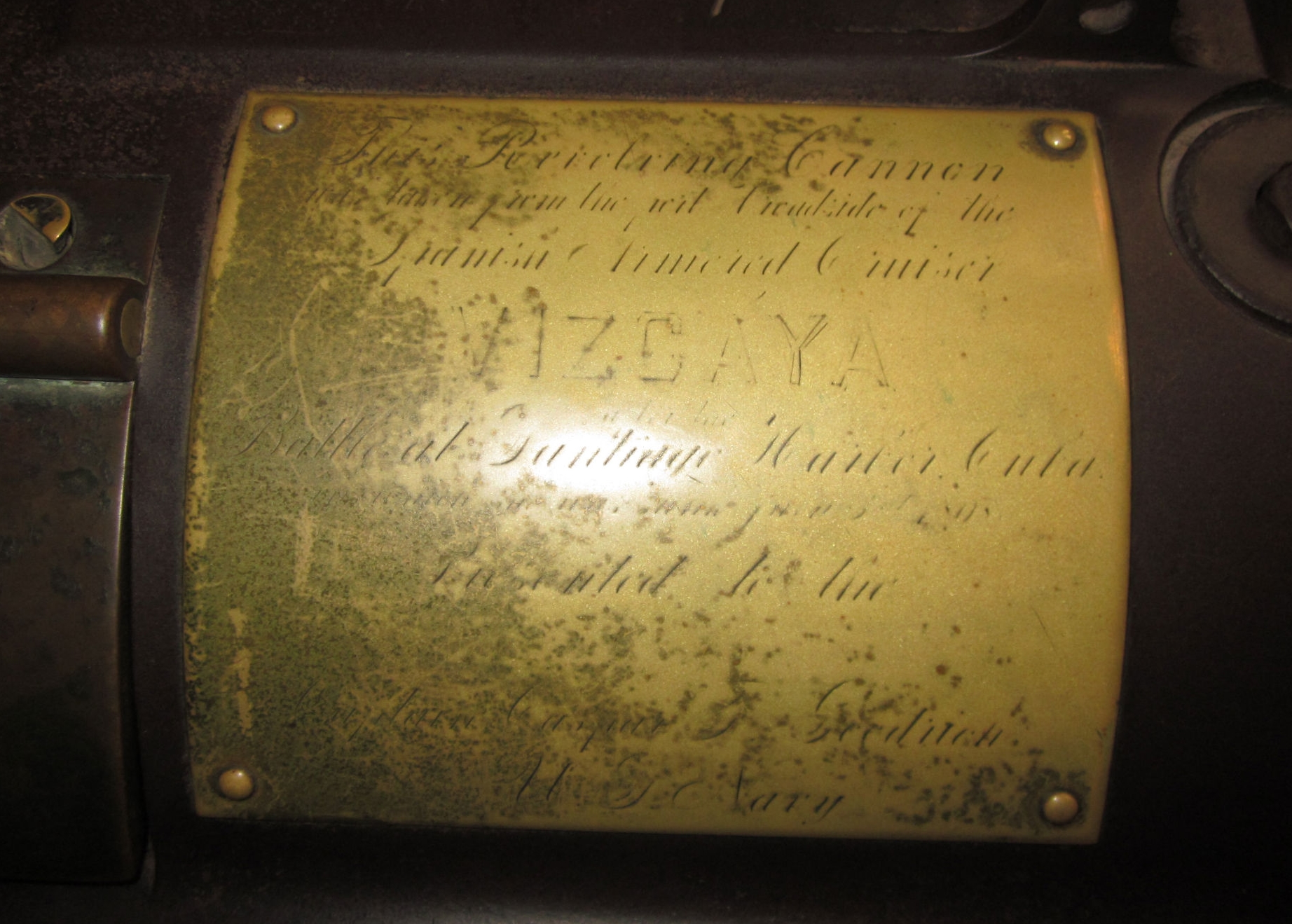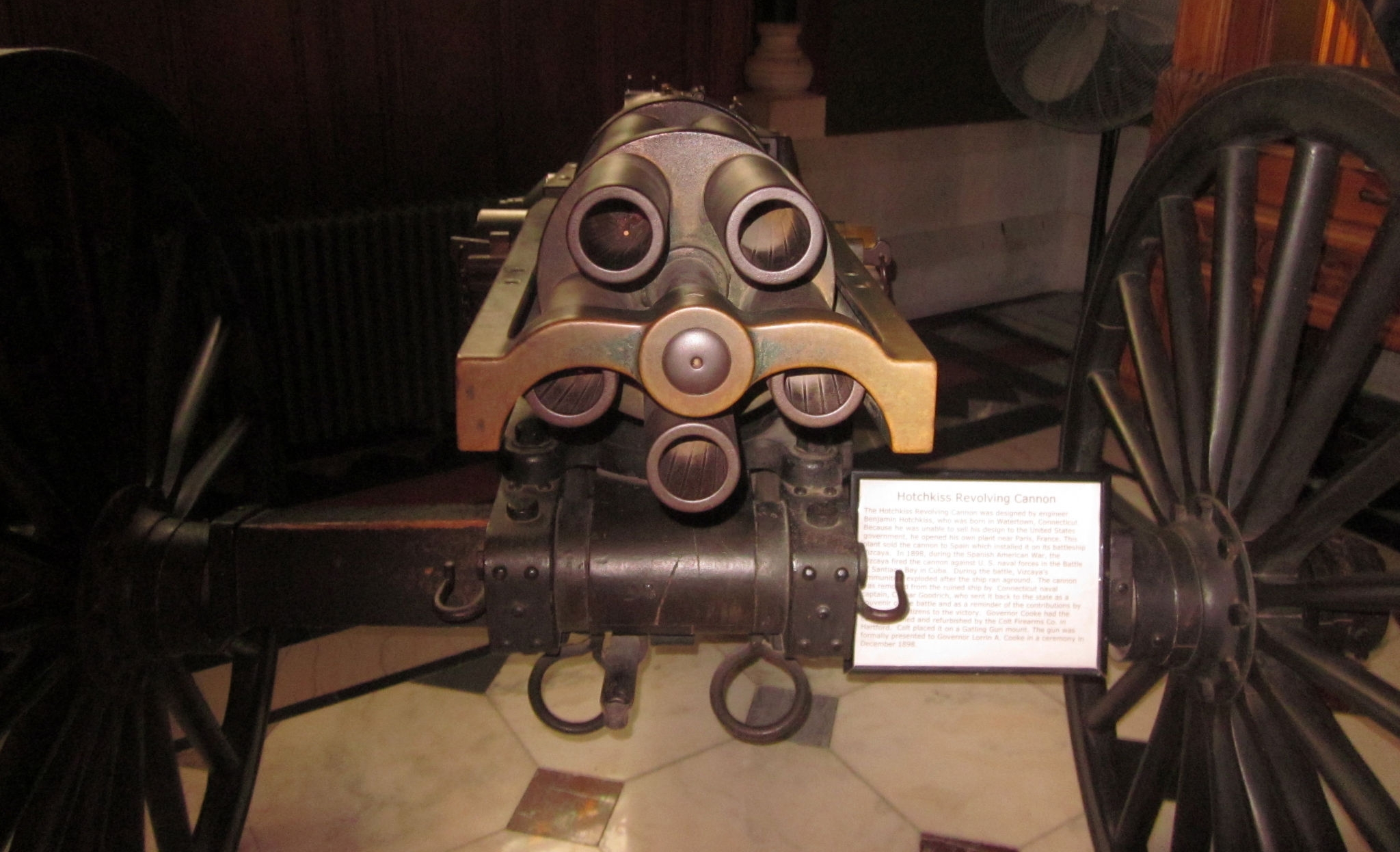 This Hotchkiss Revolving Cannon was captured from the ruins of the Spanish cruiser Vizcaya after the Battle of Santiago Bay in 1898. It was returned to the US by Captain Caspar Goodrich (USN) and put on display on a Gattling carriage at the Connecticut capitol building in Hartford (click here to download photos at high resolution).