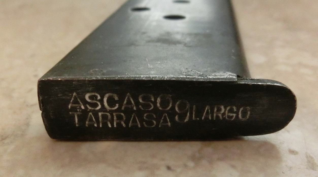 It’s the magazine for an Astra 400 copy made by the Anarchists during the war – the pistol itself will be arriving shortly. Ascaso was a noted Anarchist hero (or terrorist, depending on who you ask) who died early in the war, and a factory in Tarrasa decided to name their pistol production after him. We will get more into who he was and take a look at one of the pistols later, but in the time being there is a very interesting documentary sympathetic to the Anarchist movement available on YouTube. It was filmed at least a couple decades ago, and is largely composed of interviews with folks who participated in the war (it is in Spanish, with English subtitles). I strongly recommend it for anyone interested in seeing that side of the conflict: