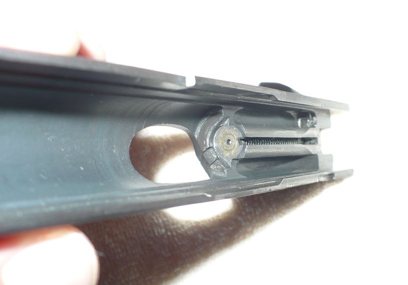 Steyr’s design was quite a good one, offering both light recoil and better than average accuracy. It did this by utilizing a gas delayed blowback system virtually identical to the last ditch German Volkssturm Gustloffwerke (VG1-5) rifle. Basically, the front half of the slide acts as a gas piston, and ports in the barrel allow gas into that piston while the bullet is still in the barrel, thus slowing down rearward movement of the slide. In the photo below, you can see the gas sealing rings machined into the barrel, to prevent that gas from venting down around the recoil spring. The piston sleeve rotates to unlock from the slide for disassembly.