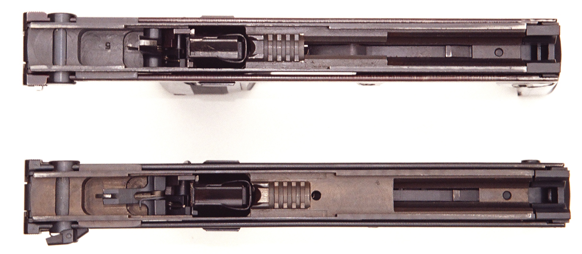 ‘slide’, which widens to the back. I presume it widens to further minimize the danger of slipping and therefore facilitate cocking the slide. On the right hand side this taper does not reach as far as on the left, because the extractor spring is situated there an needs a bit more material on the slide.