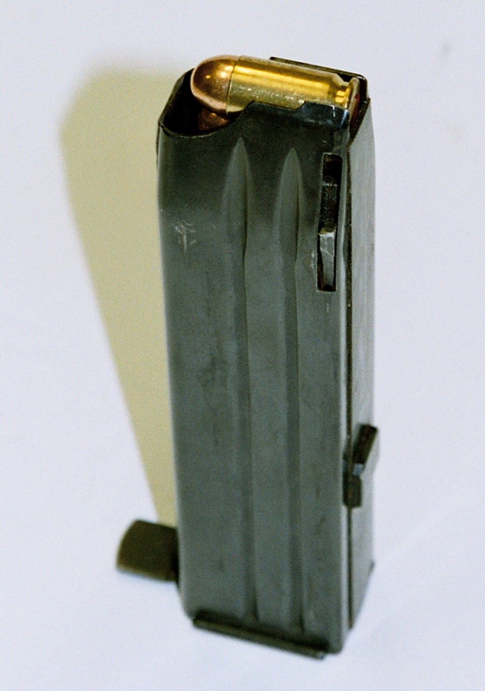 Also the case ejection is somewhat unusual. The extractor is placed in the bolt face of the slide, quite conventionally, but the ejector is actually a projection of the left magazine lip, as in the Webley & Scott M1909 pistol. Wilniewczyc liked that feature and to implement it, he went back to where all burp-gun designers fled from in horror – he revived the scepter of Schmeisser staggered-row, single feed magazine, seemingly buried deep once and for all after the WW2. Unfortunately, as if this was not a bad enough idea in itself, when combined with a cartridge so short and stubby as the 9×18 it proved very hard on loader’s fingers. The staggered-row, double feed Stechkin magazine is much easier to fill.