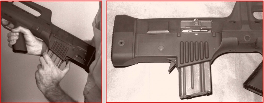 At present, the gun is chambered for the 5.56x45mm M193 ball-type cartridge, the 490mm (19.3 inch) barrel having six-groove rifling with a pitch of one turn in 305mm (1:12 inch). Production examples, as expected, will also be barreled for the newer SS109 NATO round. A flash hider is fitted to the muzzle, and a bayonet attachment is provided. Feed is from 20- or 30-round M16-type metal box magazines in the prototype, but production gun are likely to use curved 20-, 30-, or 40-round plastic magazines. The magazine is inserted upwards into its guide inside the stock, and the catch at the rear is pressed forward to release the magazine. The ejection port, which can be set easily for right- or left-handed shooters, is fitted with a spring loaded cover that snaps open as the weapon is cocked or fired.