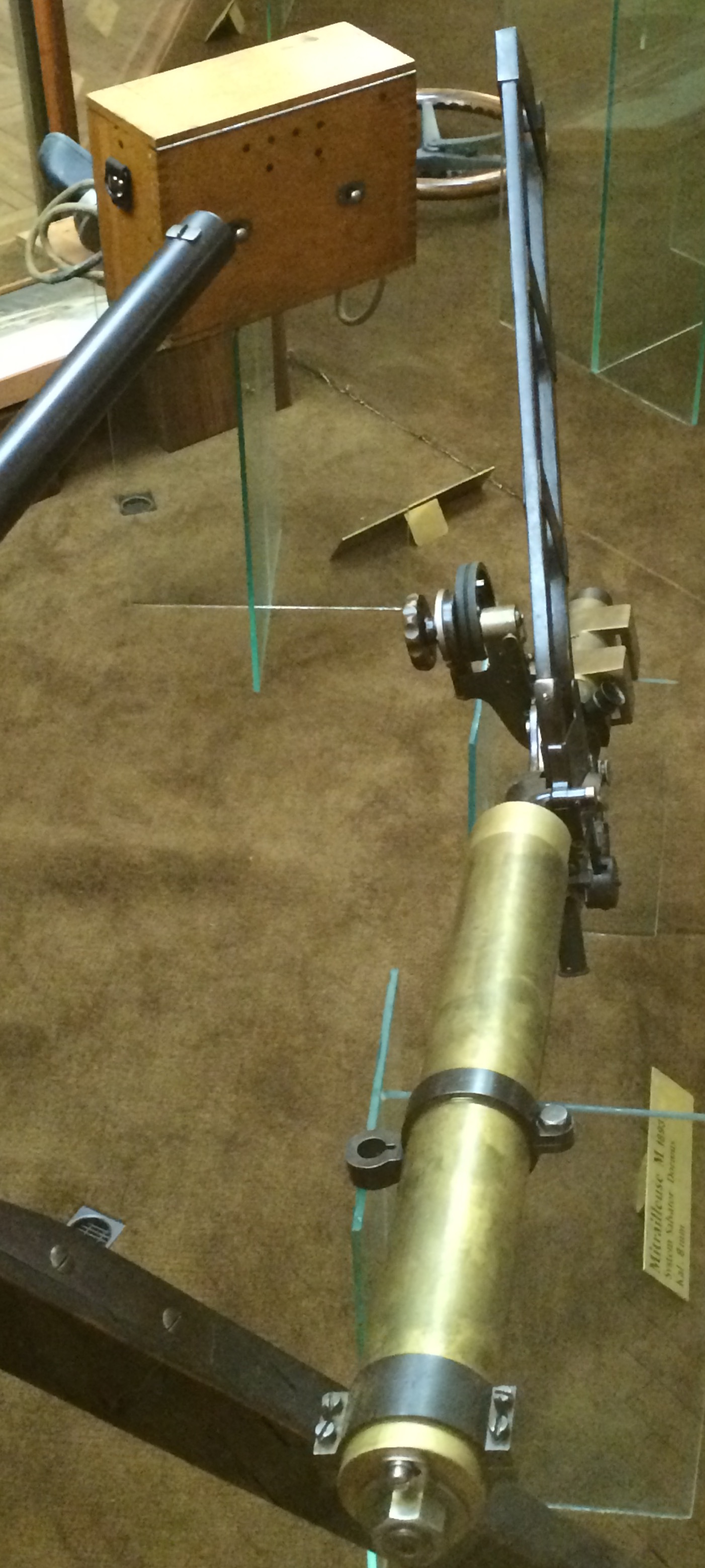 The vertical shepherds crook thingy with a roller on top seems like a dial sight to me – note the front sight post at the brass bbl casing brace is also kinda offset to the right.