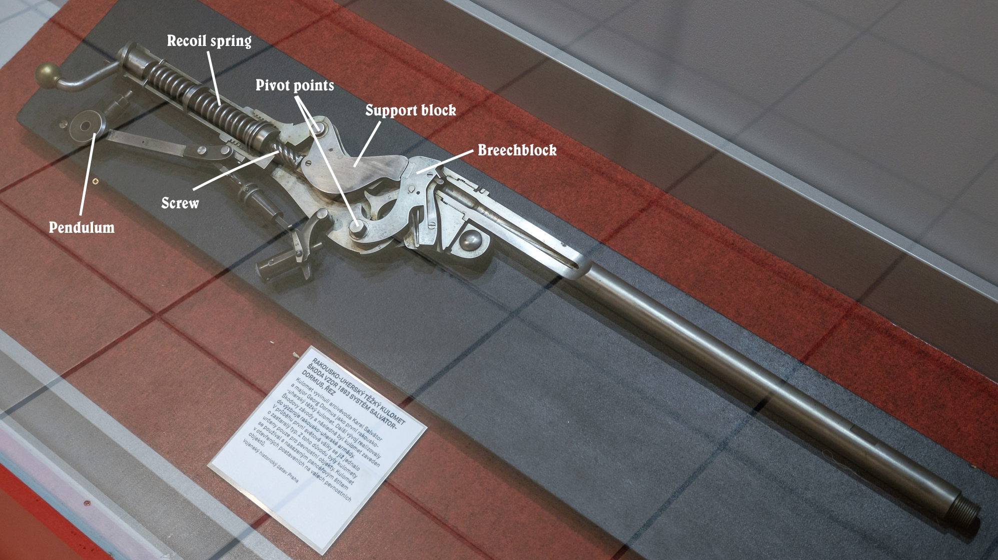 When fired, the recoil energy acted on the breechface, which has a shape roughly similar to that of an oversize revolver hammer. A supporting block held the breechface in place against the chamber such that the force of firing would push it out of the way slowly, redirecting most of the recoil energy. The resistance to opening was provided by a carefully engineered lever effect acting on a spring and a fast-threaded screw. Thus in order for the support block to move, the screw had to thread into its housing (which generated friction and slowed down the process) and do so against the force of the recoil spring (further slowing the process). The result was that the breech did not open until the pressure in the bore had dropped to a safe level. This cutaway example makes the system much clearer: