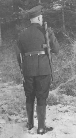 It is a Mauser after all. Take a look at the photo of the guy in peaked cap carrying the SMG slung from his shoulder – there is an outline of the Mauser-Tonne (the barrel-like Mauser Banner) on top of the magazine well. These copies are barely readable, but this weapon was described (well, hinted at, because no actual gun was available) in the now sadly defunct German weapon quarterly Waffen-Revue – Nr 87, (4/1992).