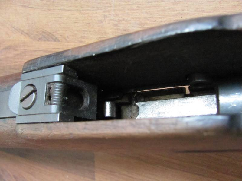 The safety on the 39M was a rotating lever at the rear end of the receiver tube, with positions for safe (Z = Zárva, or “closed”), semiauto (E = Egyenkén, or “one by one”), and full auto (S = Sorozat, or “in-a-row”). Disassembly in the field is very simple – press in the takedown button (see photo below) and rotate the receiver endcap 90 degrees. This allows the endcap to come off, after which the recoil spring and bolt will slide out the back of the receiver.