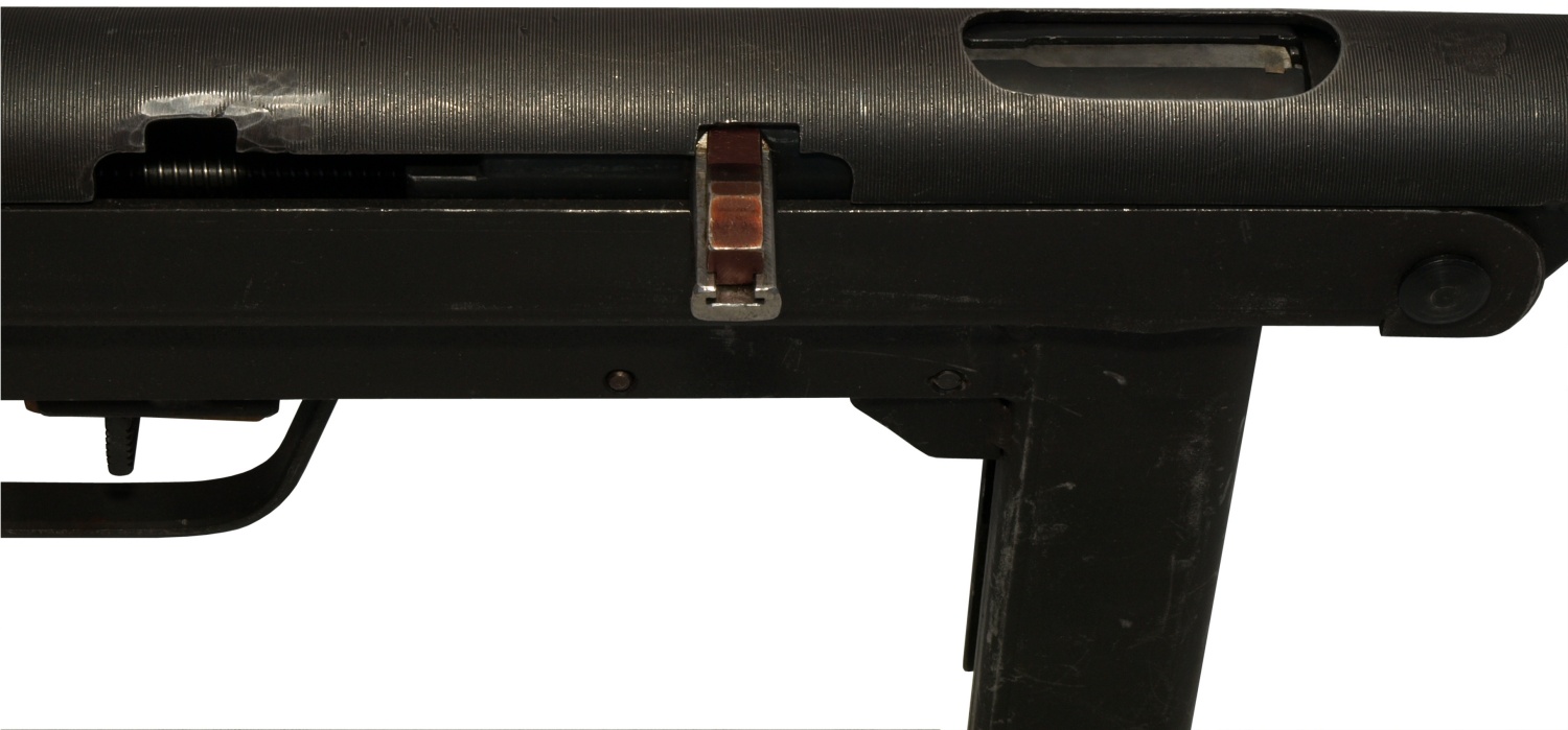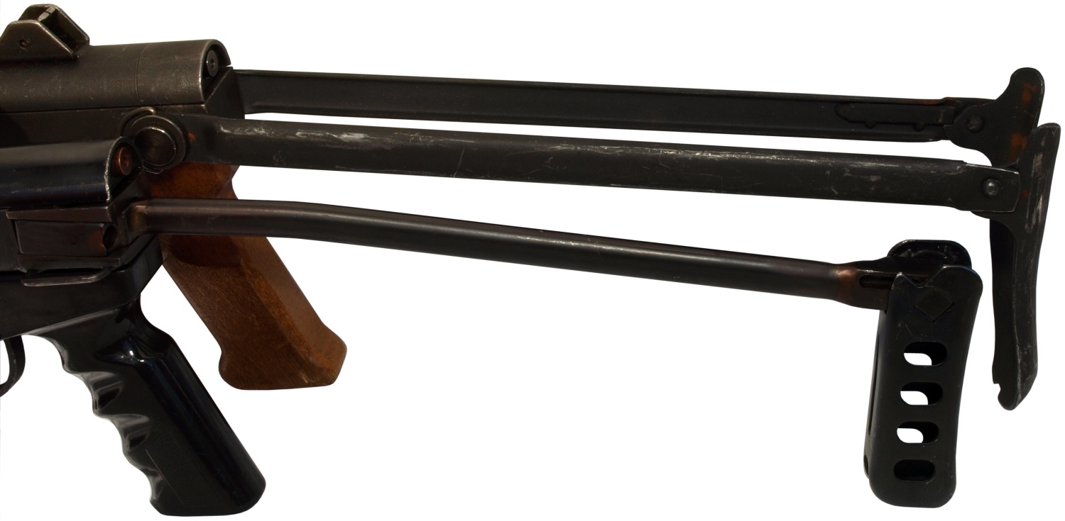 In front of the trigger frame there is a sliding selector (full auto and single shot) of the same type as the PPSh-41. The frequently encountered folding buttstock is copied from the Czech submachine gun SA vz. 25.The straight magazine holds 25 rounds.