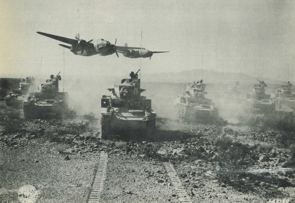 I think I’ve seen this picture before. It’s from the 1941 maneuvers and was taken I believe at Fort Hunter Liggett. (Maybe Ft. Irwin). The 1941 summer maneuvers were a massive combined-arms propaganda show with the government and press trying to make the USA look invincible and keep us out of war. Unfortunately, the unpreparedness of the military was really impossible to hide; all the panic spending and mobilization in 1940-41 just made it more evident.