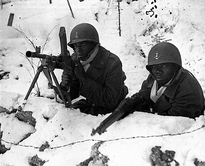 Senegalese Free French soldiers at the Battle of the Bulge in 1944, armed with a British Bren and an American 1903 Springfield. The helmets are American ones, emblazoned with the anchor emblem of the French Colonial forces. The Free French used a wide array of Allied equipment.