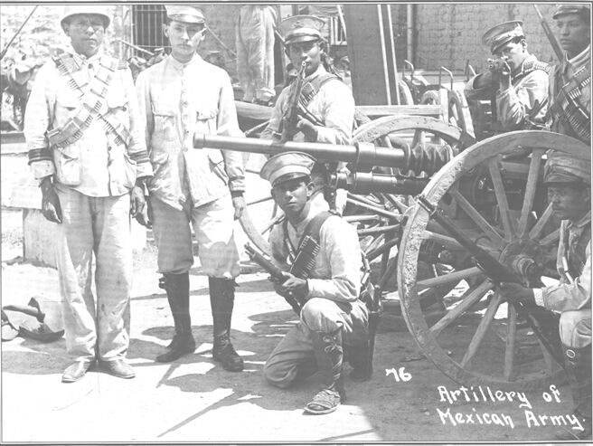 Published in Osprey’s “The Mexican Revolution 1910-20” book, this photo postcard shows a very rare Hotchkiss 37mm automatic cannon. It was designed to compete with the Vickers Pom-Pom, and apparently was only bought in small numbers by the Mexican Army and the Japanese Navy. Sent to us by Alex A. – thanks, Alex!