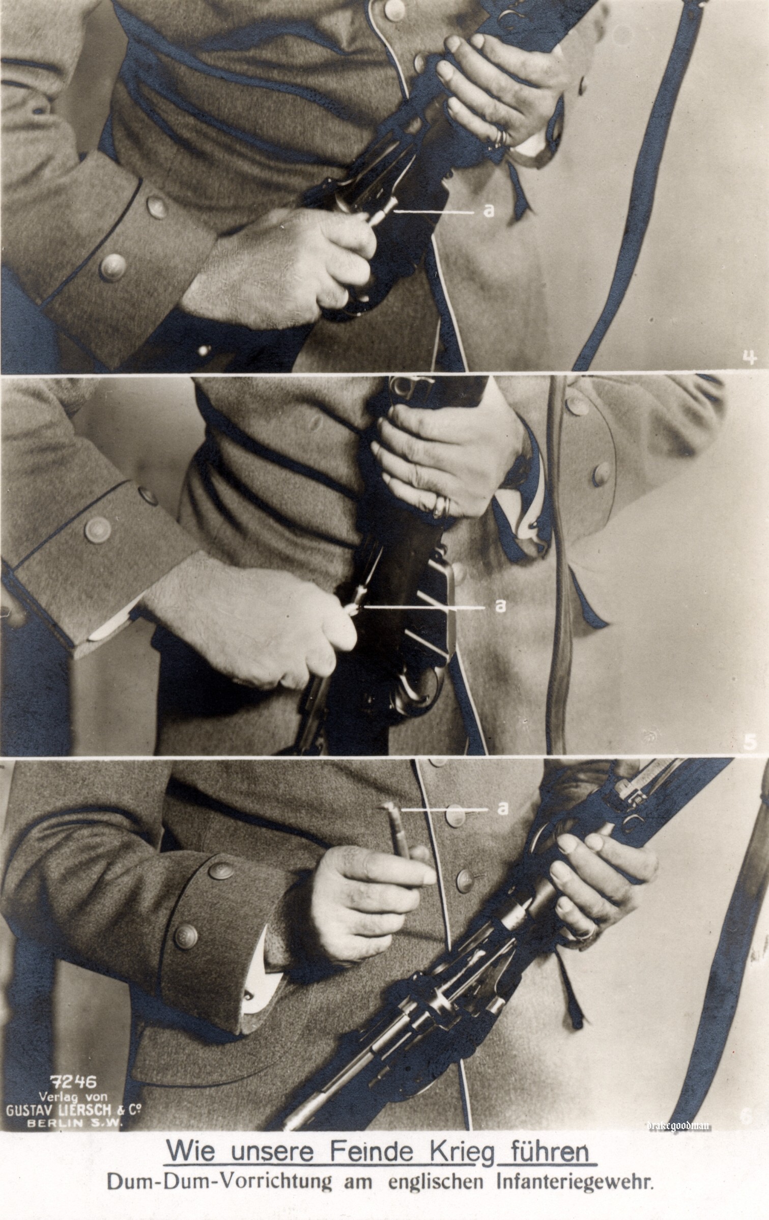 The Germans raised the issue of ‘Dum-dum bullets’ because both Germans and British had adopted the Swiss invention of jacketed bullets, but Germans put the jacket on from the front, with exposed lead at the back, and the British put the jacket on from the back with exposed lead at the front. Germany sought to make the British bullets illegal. In either case a long bullet will tumble after striking flesh, and depending on bullet velocity and construction, either flatten or fragment in the body.